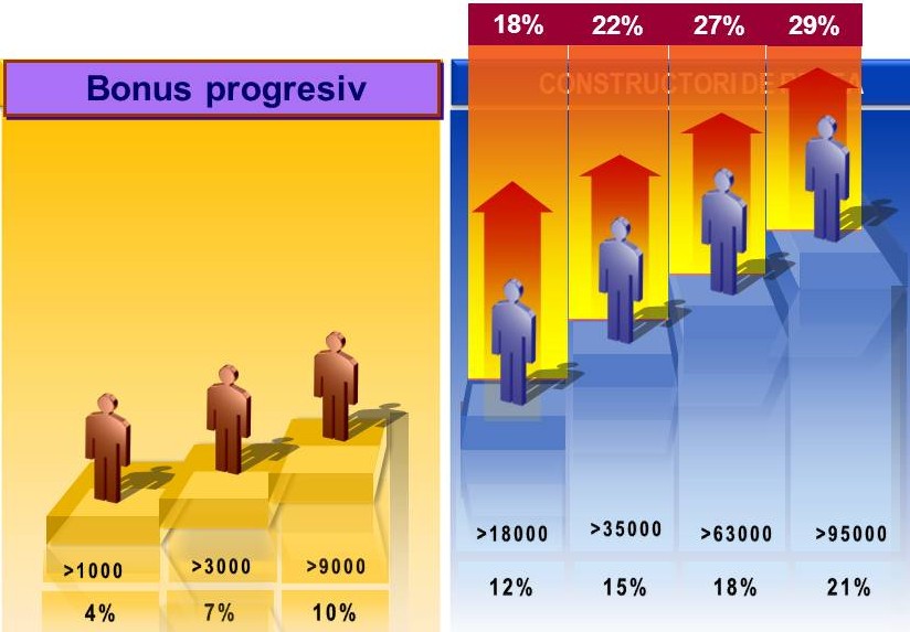 Distribuitorii care au atins nivele de performanţă 12%, 15%, 18%, 21% au dreptul la Bonusul Progresiv de Recompensă dacă îndeplinesc toate condiţiile specificate în Regulamentul de functionare. Acest bonus le permite Distribuitorilor Plini (de la nivelul de 12%) să îşi crească bonusul lunar primit la o valoare mai mare decât cea indicată de nivelul lor nominal de performanţă, dacă îndeplinesc condiţiile necesare.